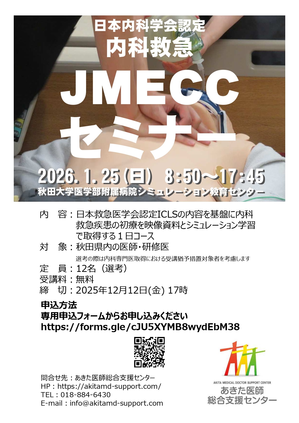 JMECC(Japanese Medical Emergency Care Cours :日本内科学会認定内科救急・ICLS講習会)は、心肺停止のみならず緊急を要する急病患者に対応できるよう日本救急医学会策定の「ICLS」を基礎に日本内科学会独自の「内科救急」をプログラムに導入した実技を中心とした講習会です。